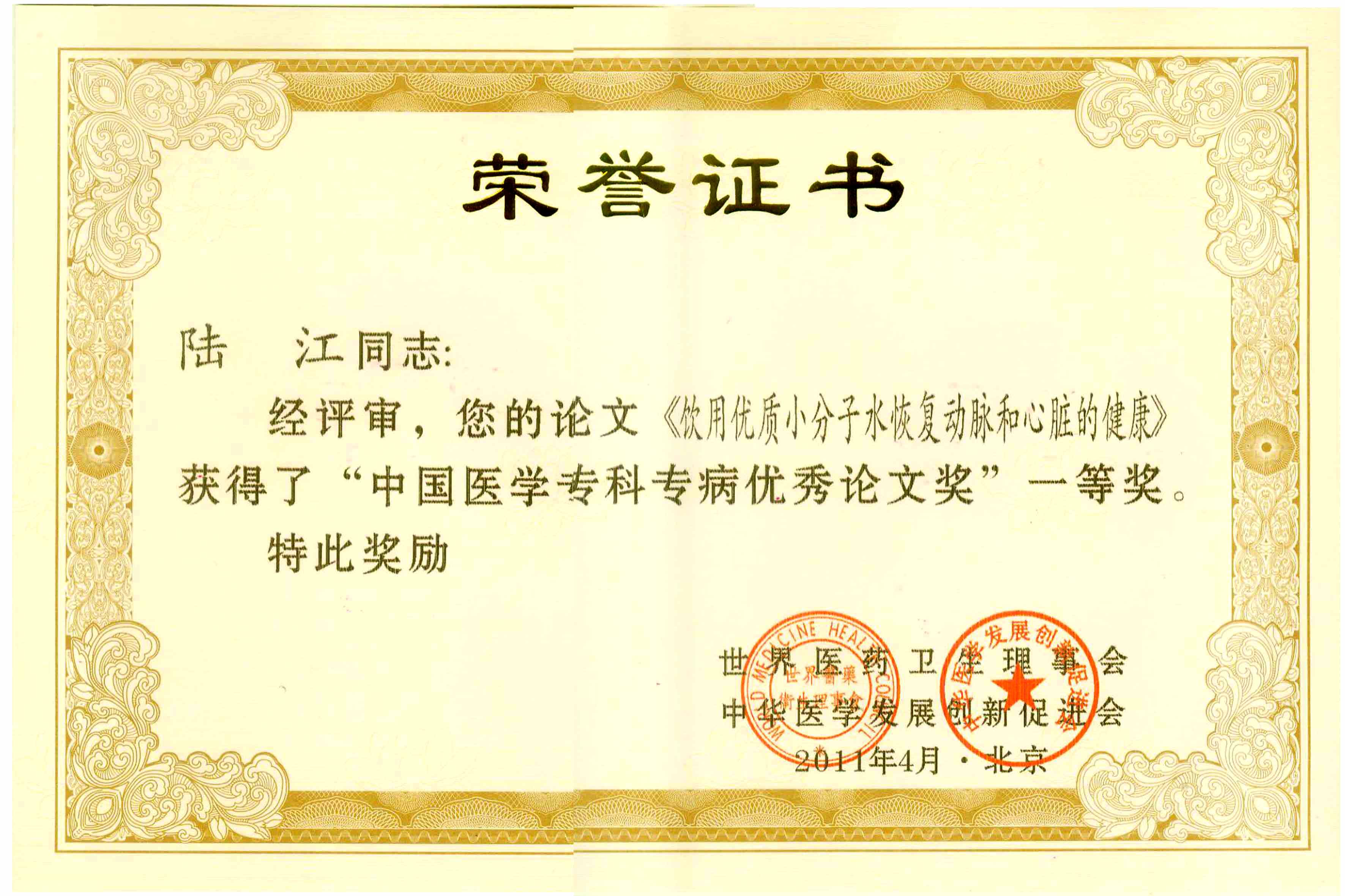 《飲用小分子水治療高血脂》獲優(yōu)秀論文獎
