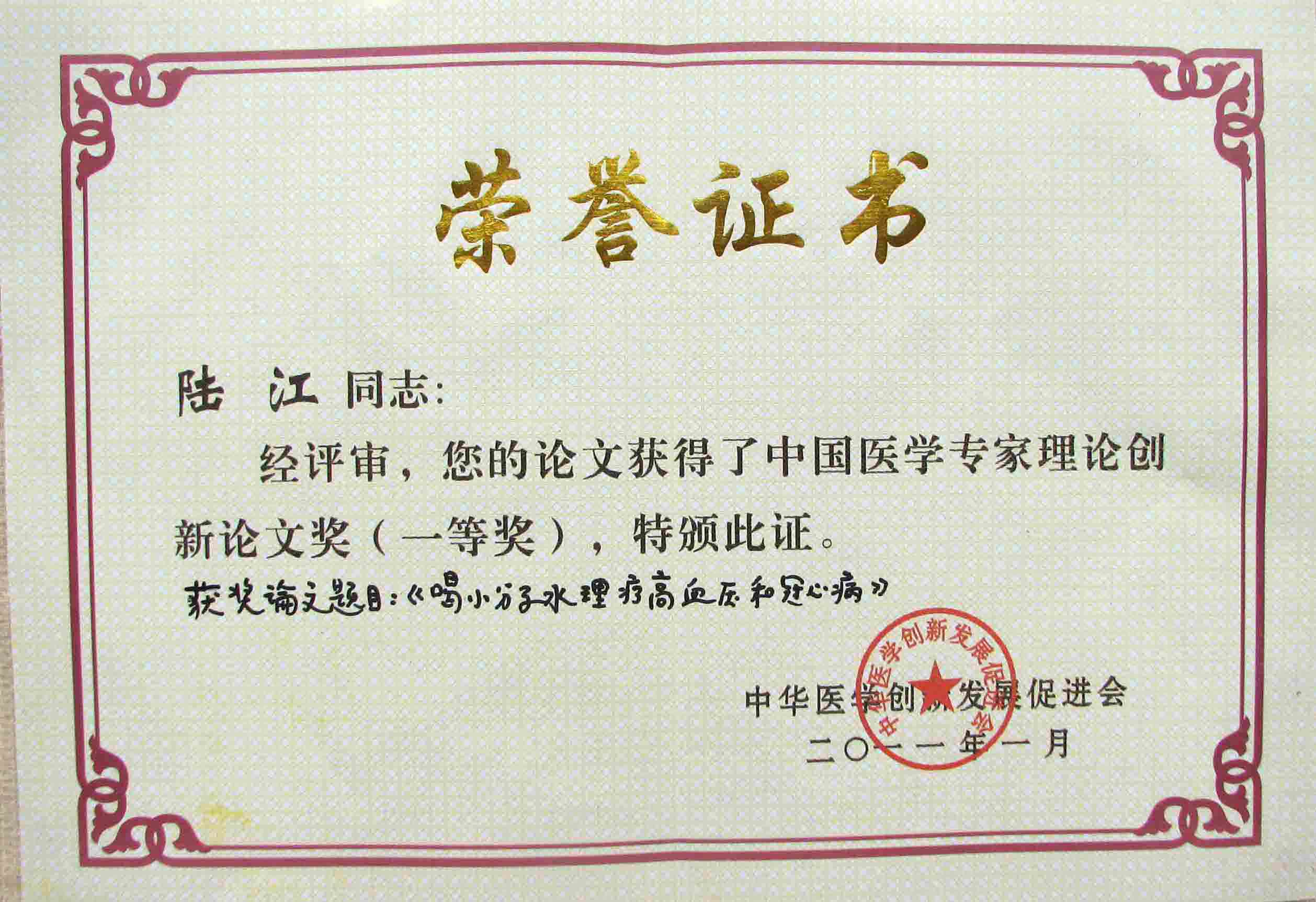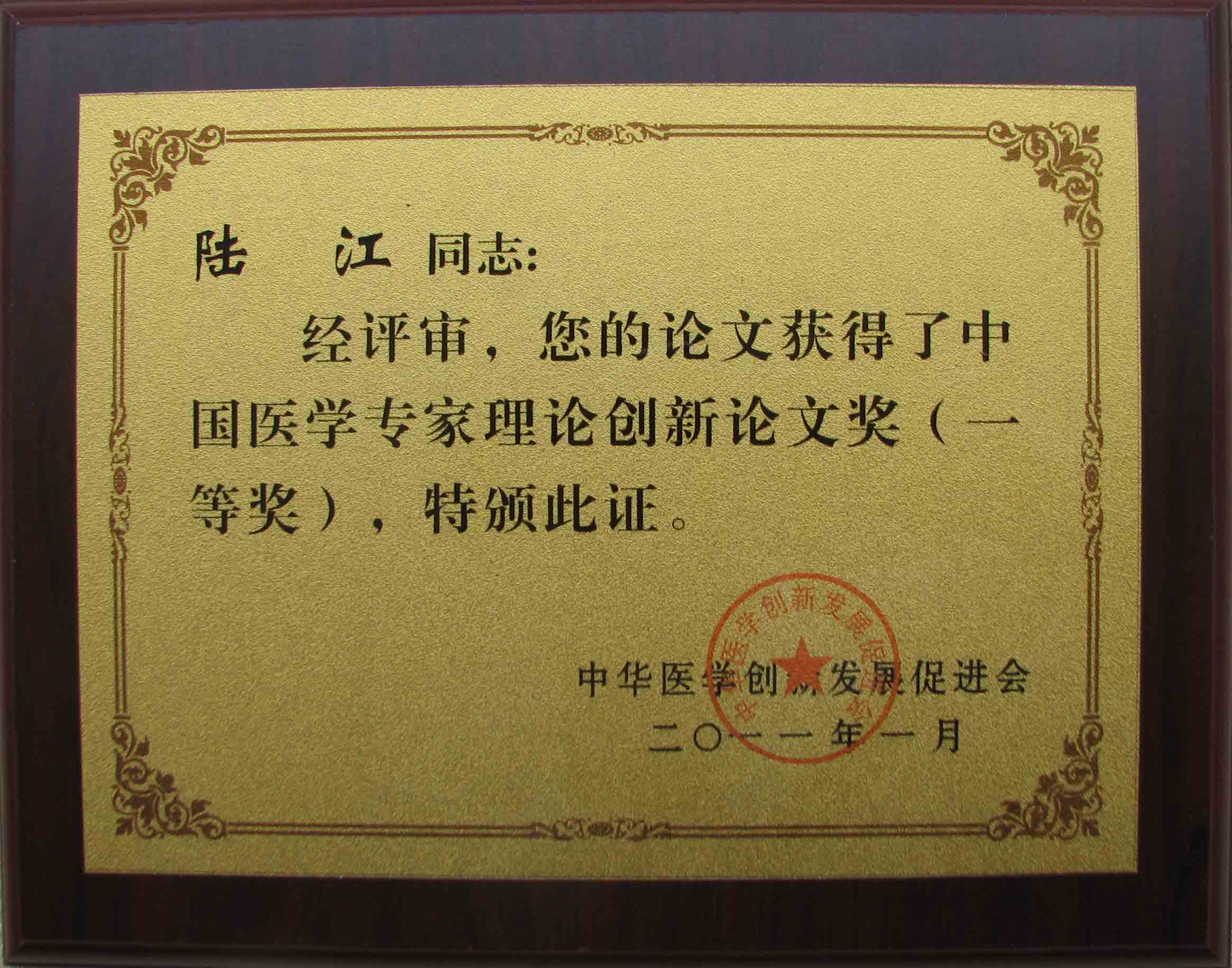 陸江的論文獲一等獎榮譽(yù)證書-- 陸江論文獲創(chuàng)新論文獎牌